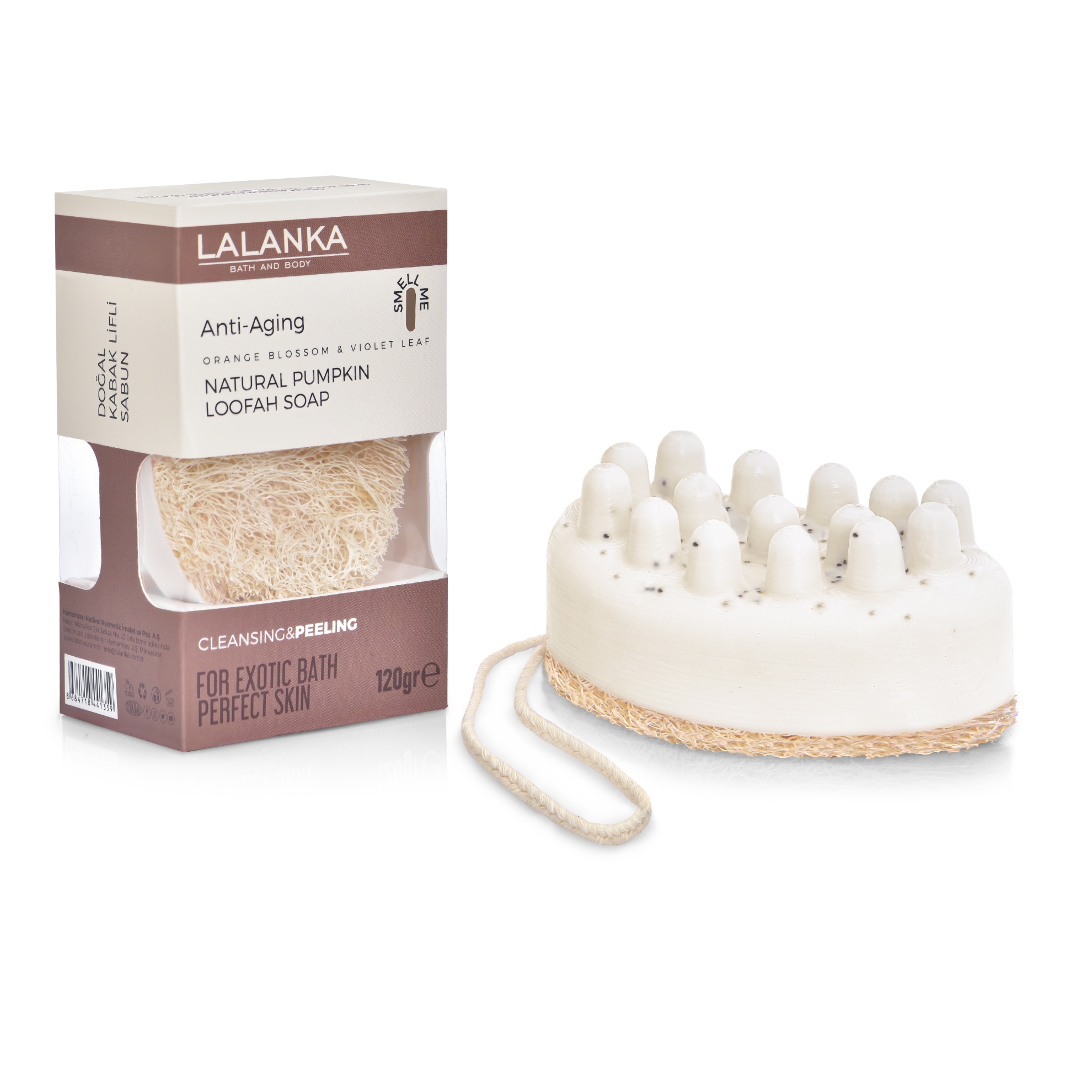 Yaşlanma karşıtı doğal kabak lif sabunu, peeling etkisiyle cildi yeniler, çizgileri azaltır ve cilde canlılık kazandırır.